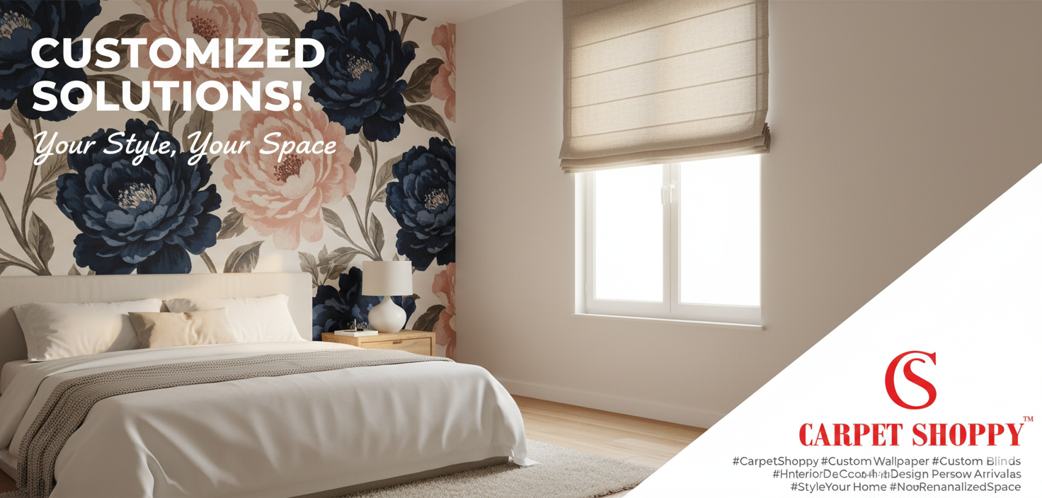 This captivating social media image presents a serene and stylish bedroom scene, designed to highlight 'Customized Solutions' for home decor, featuring both wallpaper and window treatments.